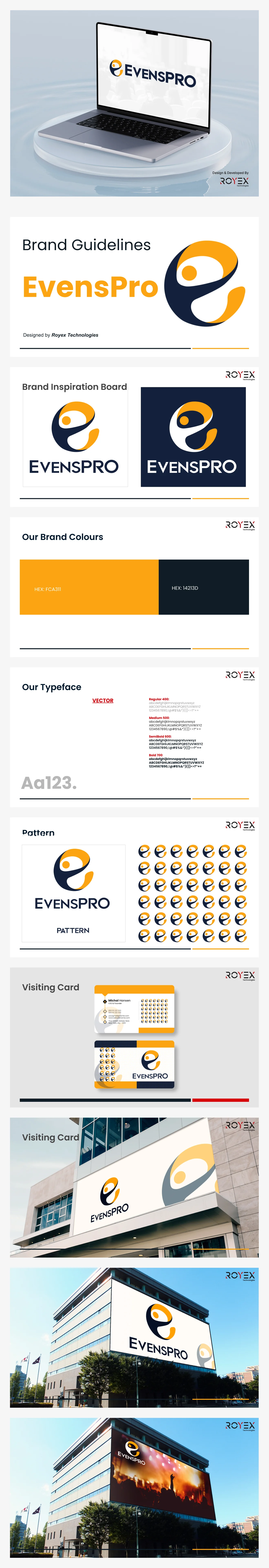 The EvensPro brand guidelines present a strong corporate identity with a bold logo, orange and dark blue palette, and modern typography. It includes logo applications, patterns, and stationery designs like business cards and letterheads, extending to large-scale building signage. The system ensures brand consistency, professionalism, and visibility across digital and physical platforms.